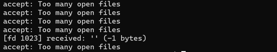 on the client side once the total number of file descriptors (fds) reaches 1024. This happens because the default maximum number of open files is set to 1024, which can be checked using ulimit -a