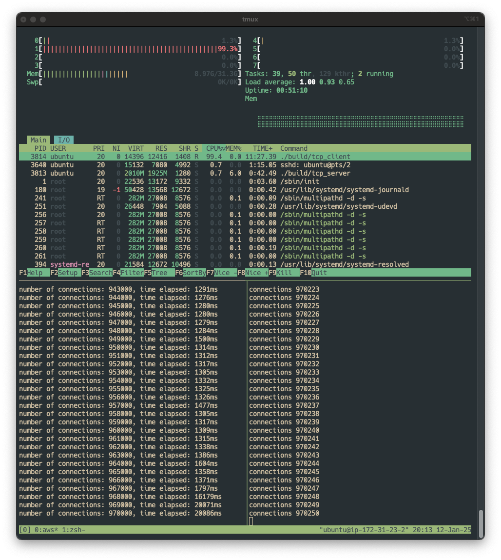 . Since there will be at least one million fds on either the client or server, we need to increase this limit to a value slightly above that, such as 1048576 (1024 * 1024), using ulimit -n 1048576