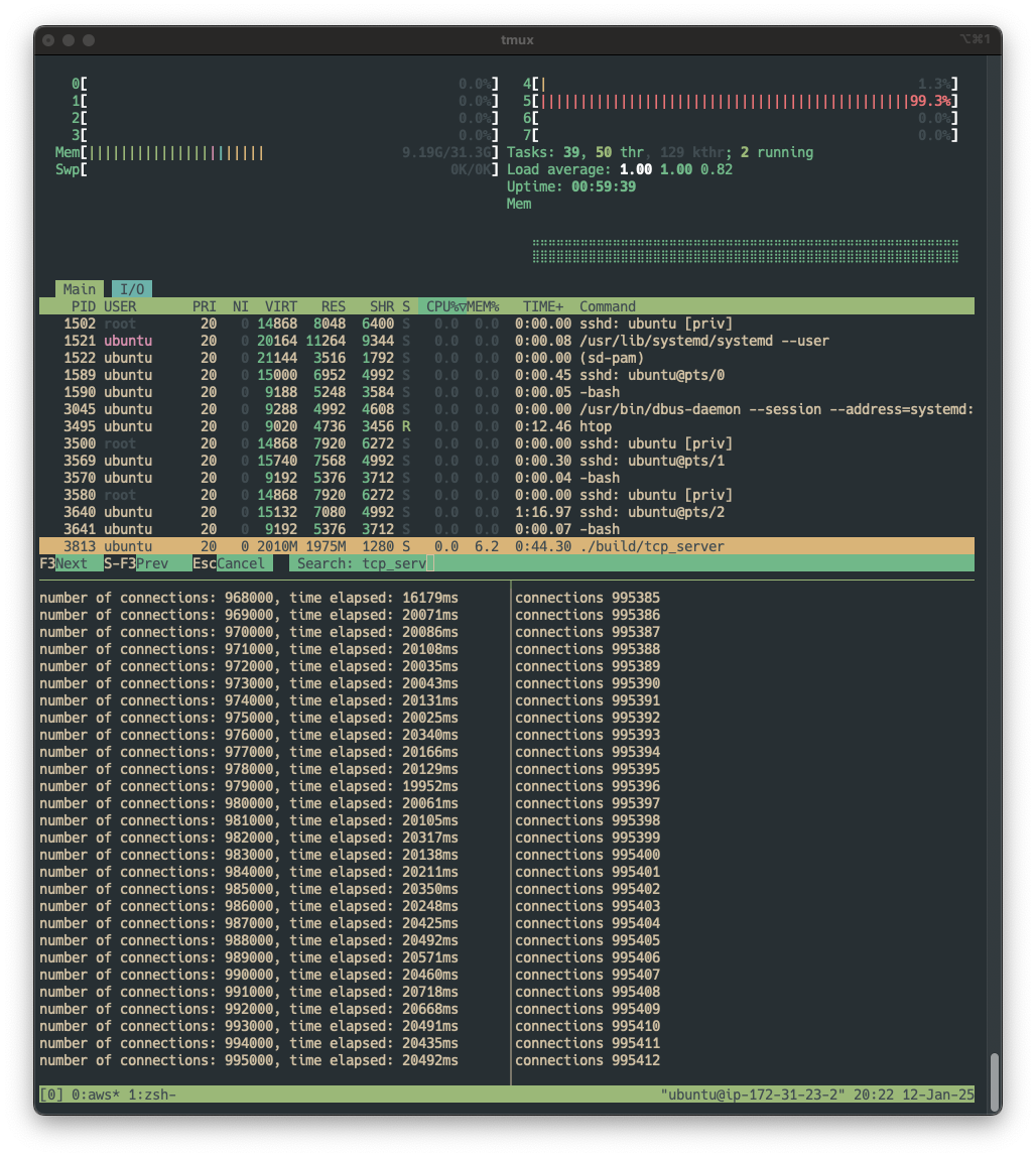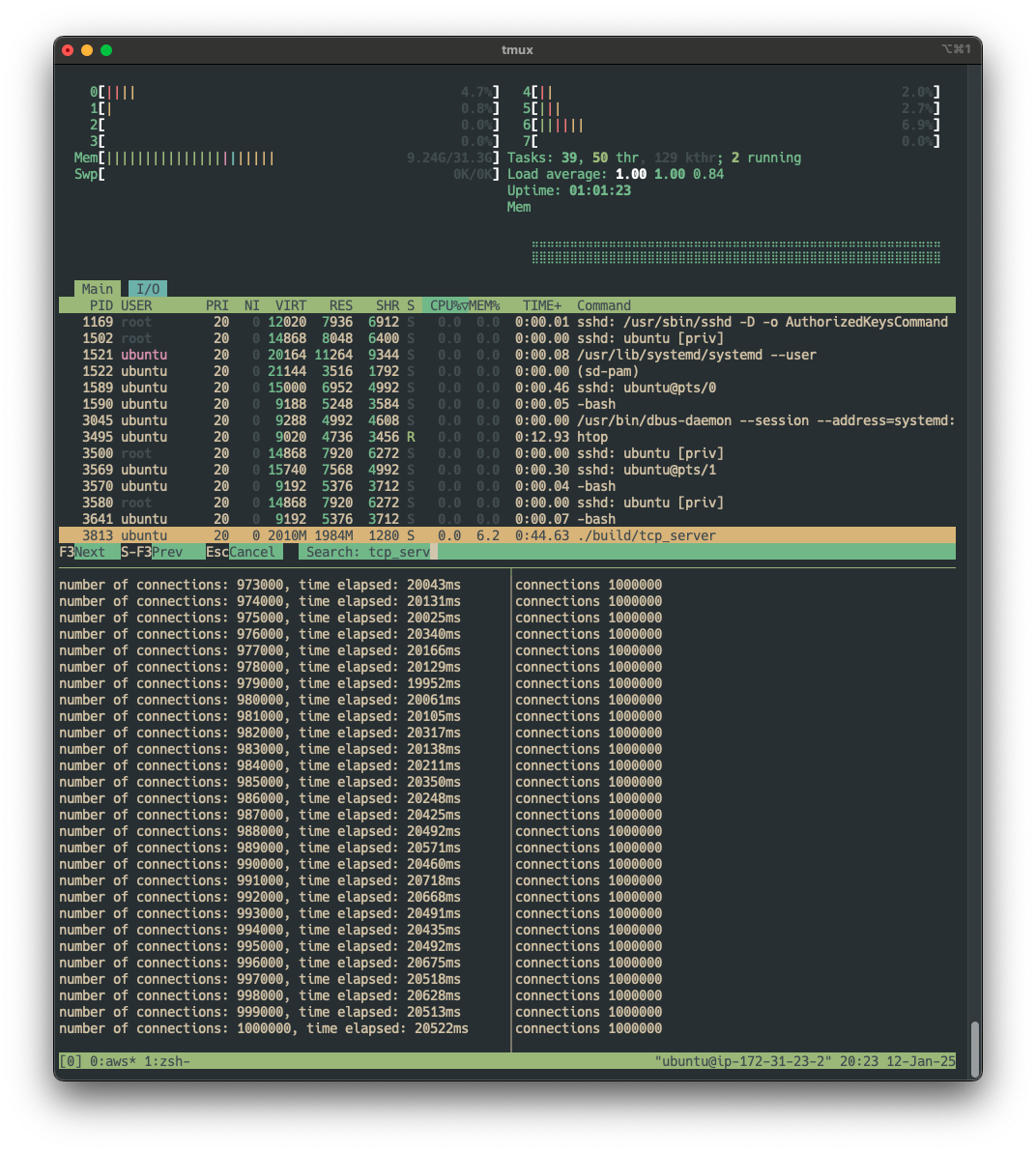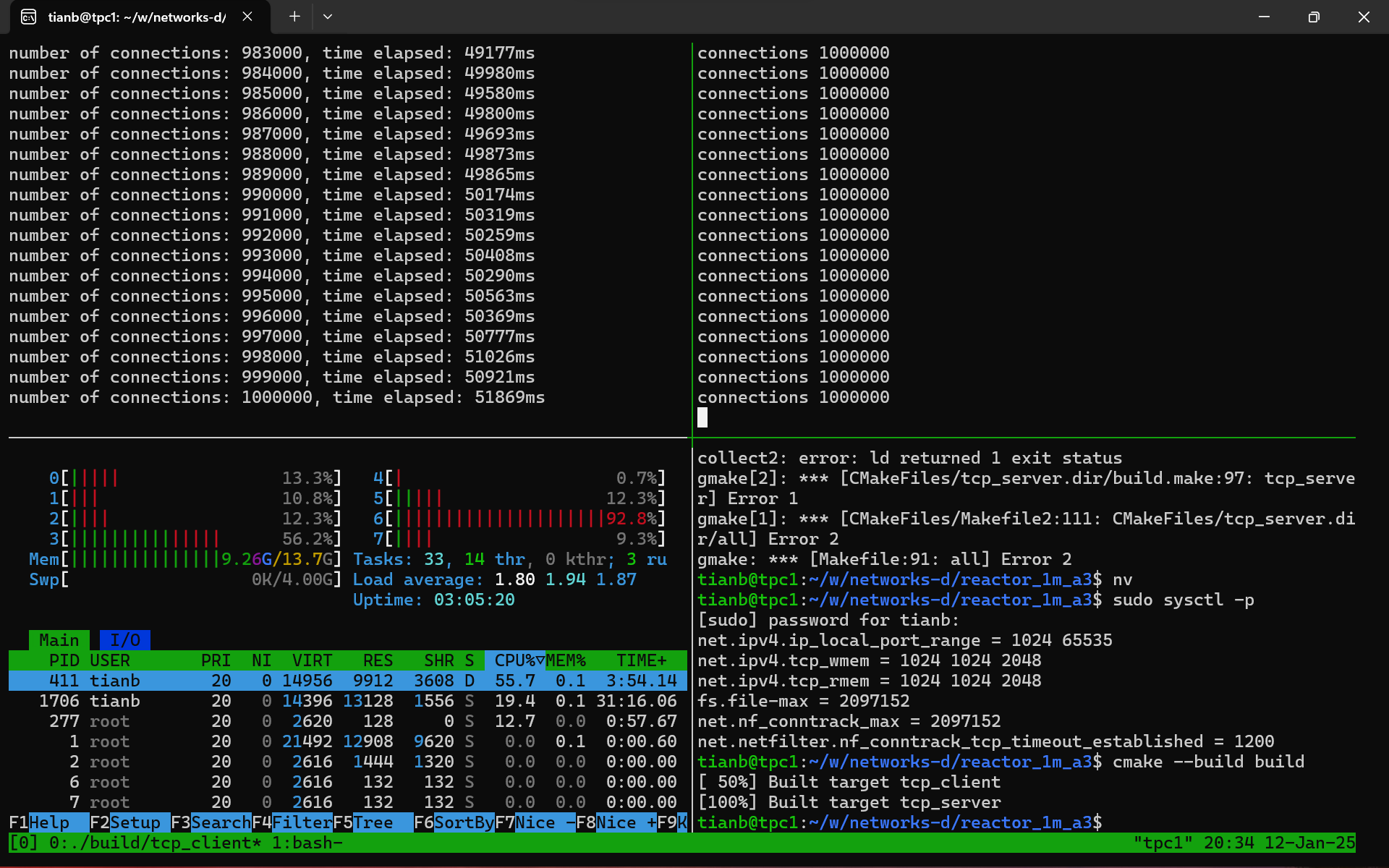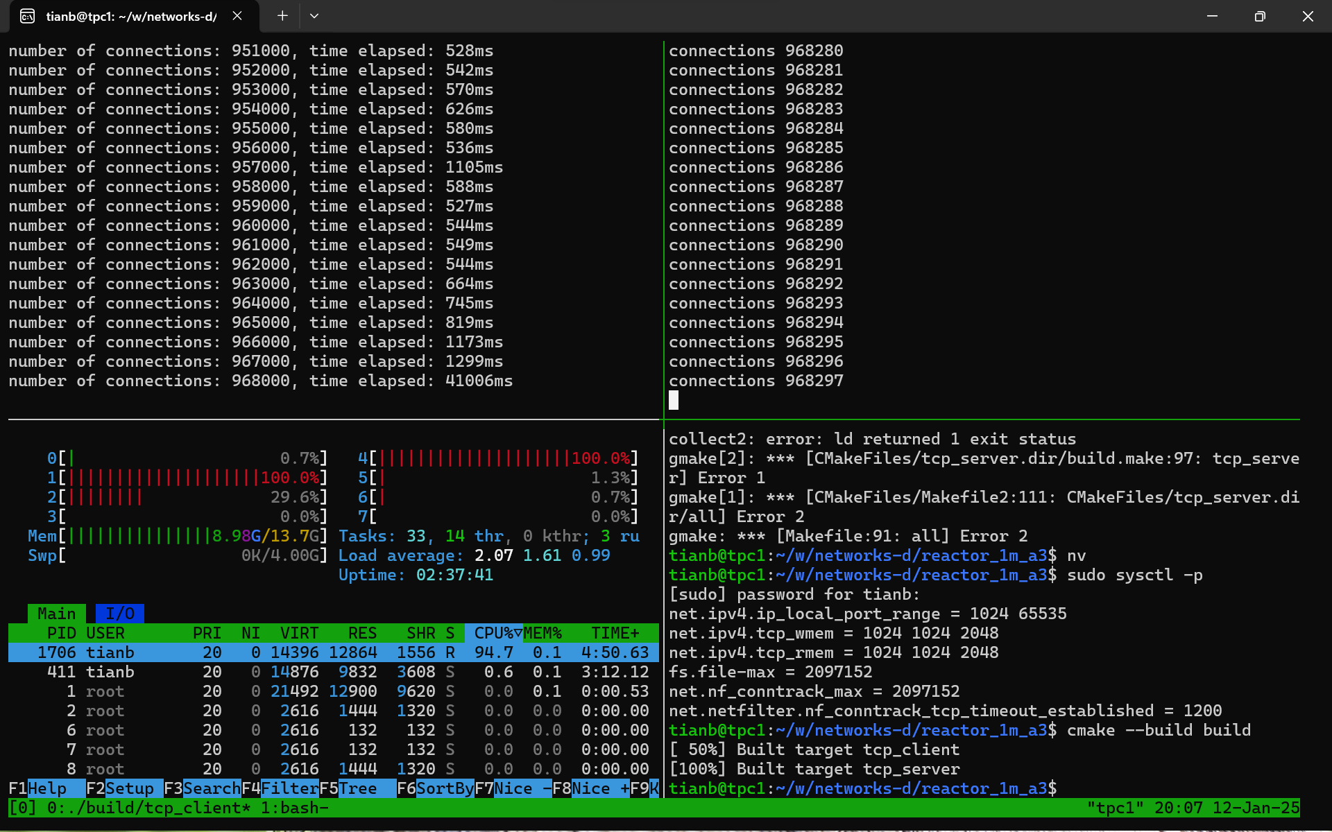 We'll begin with the TCP server implemented using the Reactor pattern, as discussed in Reactor. To test its capabilities, we'll create a client program that attempts to establish one million connections and then send and receive data in a non-blocking manner.